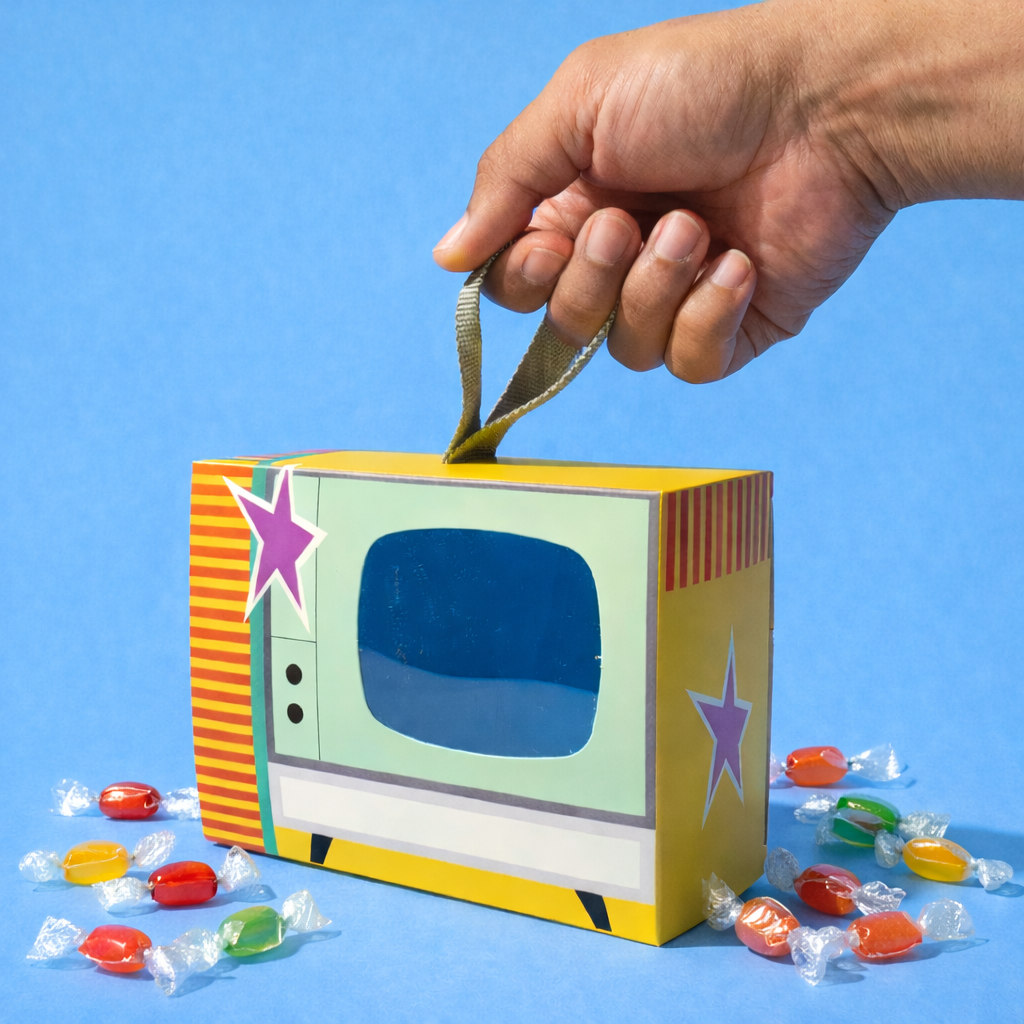 We return to the old days through the design of the television and how it once looked. This box is designed in the shape of a vintage TV, featuring a screen opening made from a transparent material, along with a grey top handle inspired by the TV antenna. It is perfectly suited for occasions, giveaways and is especially ideal for Ramadan.